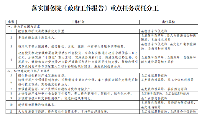国务院《政府工作报告》明确的工作任务主要由国家部委作为落实主体,各责任单位要认真围绕各项重点工作任务,加强与省级、市级对口部门沟通对接,积极做好对上争取工作,力争更多的国家重大政策、重大资金、重大工程在我县落地见效。