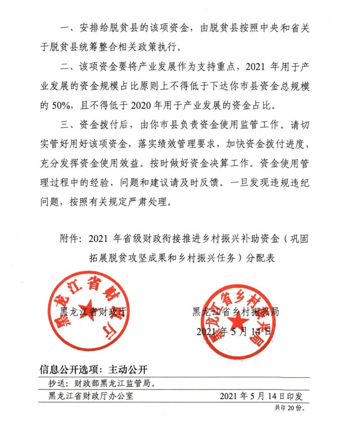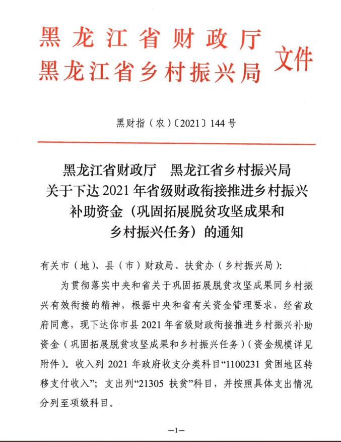 黑财指农【2021】144号 黑龙江省财政厅 黑龙江省乡村振兴局关于下达2021年省级财政衔接推进乡村振兴补助资金(巩固拓展脱贫攻坚成果和乡村振兴任务)的通知